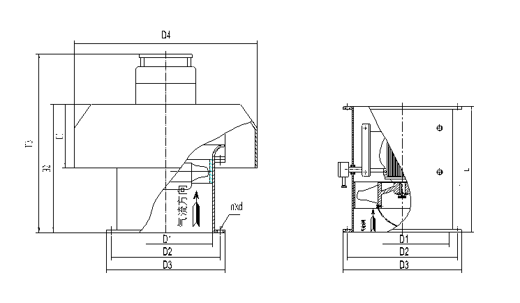 II型防爆通風(fēng)機不帶風(fēng)帽,防爆電動機為內(nèi)裝式,由靜葉撐腳固定在機殼上??闪⑹交蚺P式安裝,也可安裝在甲板上??捎糜诔轱L(fēng)或送風(fēng)。